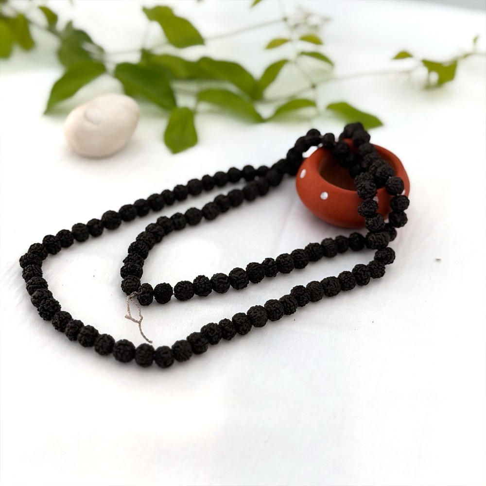 This sacred mala is made from 5 Mukhi (Five-Faced) Black Rudraksha beads, traditionally associated with Lord Shiva.